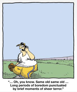 Secondly, I guess there has been some issues with the gate on the diamond, to the point where someone took the time to make a sign to help with the direction the gate opens, in addition they included a Larson cartoon. I have used the same cartoon in the blog several times, with a slight change. So, the other thing that happened to me was I opened the gate the wrong way, when coming off the diamond and walked right in to the gate, giving myself a little gash and a bruise, this has never happened to me at this diamond before...Stupid sign!! On a positive note, I threw to first and home with decent throws. Cookie would have caught my throw at home, if the runner hadn't run in to him and knocked him down, knocking the change out of his pockets. (Who carries change in their pockets when playing baseball?) The runner was called out.