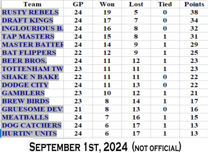 Last week, was officially the last week of the 2024 regular season and this upcoming week is a week for make-up games. This week we still have 3 games remaining and it might effect the standings a little bit, but most teams are locked in to their spots. The Beer Cup will definitely come down to the final game between the Shake and Bake and the Gruesome Devils, who will be the Beer Cup winners? Last season the Inglorious Batsters won the league, the keg party and the Beer Cup... and the Gamblers won the championship against the Beer Bros in the final.